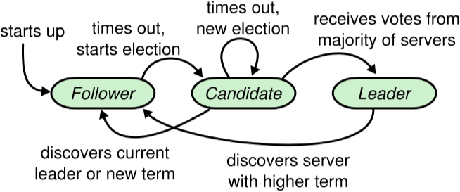 一个 Raft 集群包括若干服务器,以典型的 5 服务器集群举例。在任意的时间,每个服务器一定会处于以下三个状态中的一个: