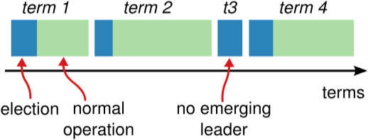 Raft 算法将时间划分为任意长度的任期(term),任期用连续的数字表示,看作当前 term 号。每一个任期的开始都是一次选举,在选举开始时,一个或多个 Candidate 会尝试成为 Leader。如果一个 Candidate 赢得了选举,它就会在该任期内担任 Leader。如果没有选出 Leader,将会开启另一个任期,并立刻开始下一次选举。Raft 算法保证在任意一个任期内,最多只有一个 Leader。