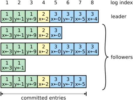<term, index, cmd>,其中 cmd 是可以应用到状态机的操作。 - log:由 entry 构成的数组,每一个 entry 都有一个表明自己在 log 中的 index。只有 Leader 才可以改变其他节点的 log。entry 总是先被 Leader 添加到自己的 log 数组中,然后再发起共识请求,获得同意后才会被 Leader 提交给状态机。Follower 只能从 Leader 获取新日志和当前的 commitIndex,然后把对应的 entry 应用到自己的状态机中。