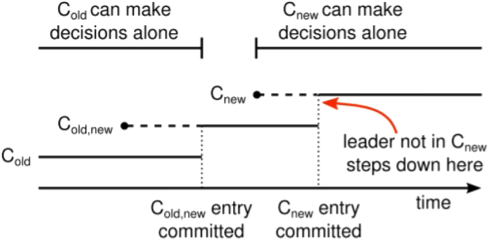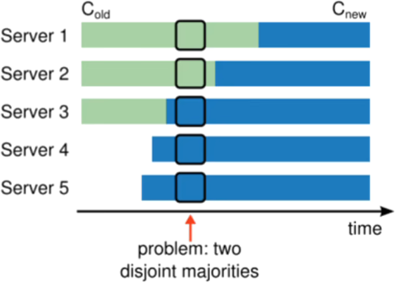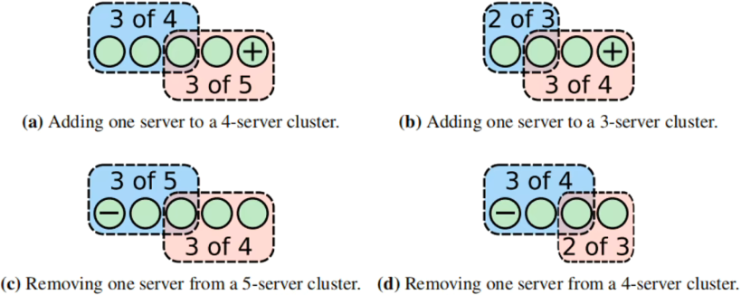其原因在于新旧配置的“大多数”(majority)必然存在重叠节点,这些重叠节点的投票只能投给一个配置(要么旧配置,要么新配置),从而避免了脑裂(split brain)问题。这样增减一个节点的情况下,就可以不经过联合一致,直接从老配置切换到新配置。