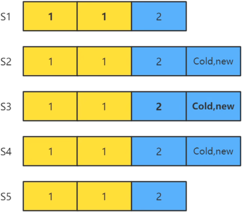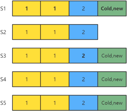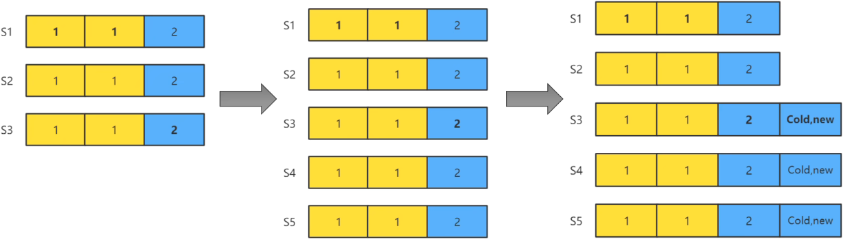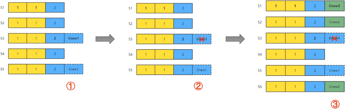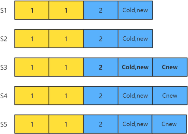 图片所示为 5 节点集群(S1、S2、S3、S4、S5)缩容到 3 节点集群(S1、S2、S3)。这时如果 Leader 宕机了,