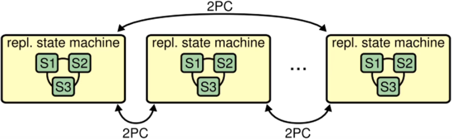 - 不仅数据量大,数据之间还存在关联,这时一个共识算法集群容纳不了所有的数据。这种情况下,就要把数据分片到多个状态机中,状态机之间通过 两阶段提交 来保证一致性。这类场景主要是一些如 Spanner、OceanBase、TiDB 等支持分布式事务的分布式数据库。它们通常会对 Paxos 或 Raft 等共识算法进行一定的改造,来满足事务级的要求。