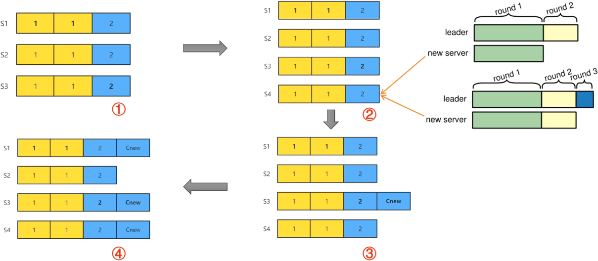- 新增节点时,需要等新增的节点完成日志同步再开始集群成员变更。这是为了防止集群在新增节点还未同步日志时就进入联合一致状态或新配置状态,影响正常命令日志提交。