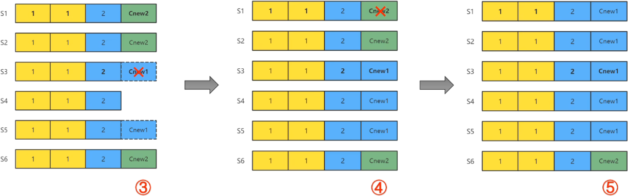 。和联合一致方法一样,当前的 Leader S3 有 的日志后,它就按照新配置来执行了。也就是说 只有复制到了三个节点以上才能完成提交。 复制到了 S1 和 S4 中,S3 完成了 的提交,单节点成员集群变更完成。