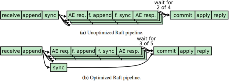 分析 Raft 的性能:最根本的,每完成一个日志(命令)的复制与提交,需要的网络(RPC)来回次数。Raft 在理想情况下,只需要一次 AppendEntries RPC 来回即可提交日志(理论上的极限)。
